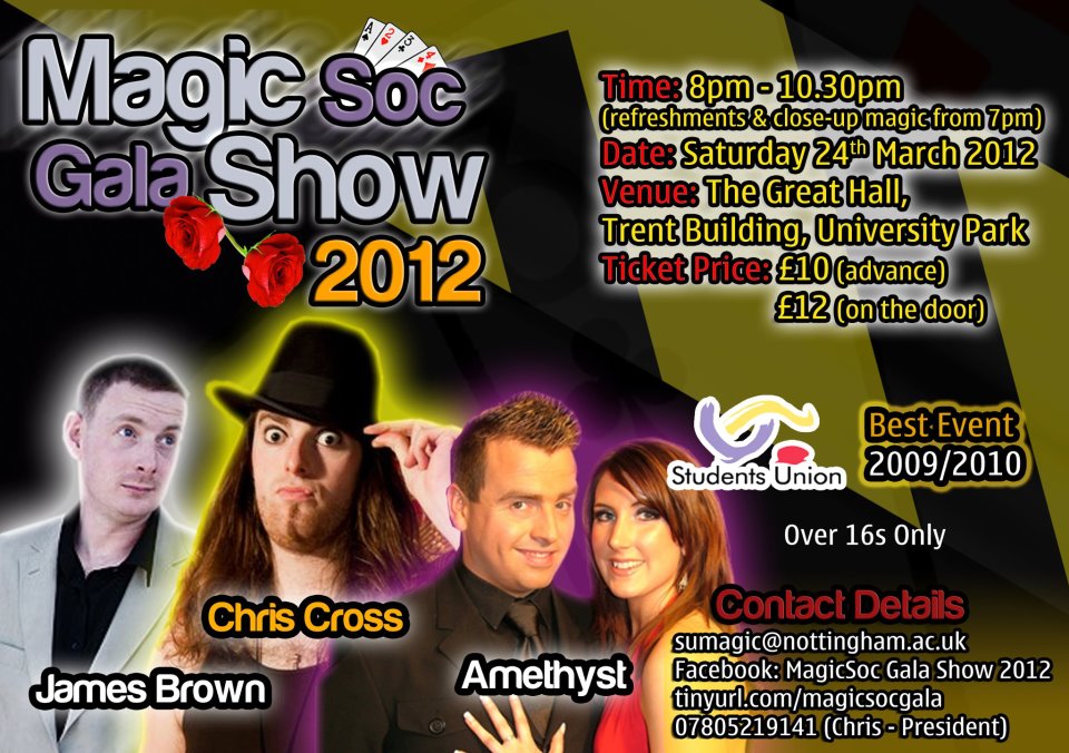 The University of Nottingham Magic Society is proud to present our award-winning MagicSoc Gala Show! This year we are excited to feature three professional and internationally acclaimed acts.